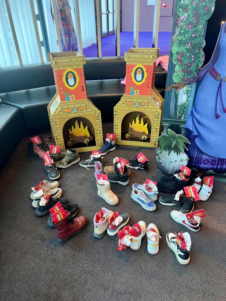 Bij aankomst werden de kinderen feestelijk ontvangen met buttons van hun gekozen film, popcorn, snoep en drinken. Ook lagen er kleurplaten en potloden klaar, en bij de open haarden mochten ze natuurlijk hun schoen zetten. Terwijl de Pieten rondliepen en strooiden met pepernoten, hing er een ontzettend gezellige Sinterklaassfeer.